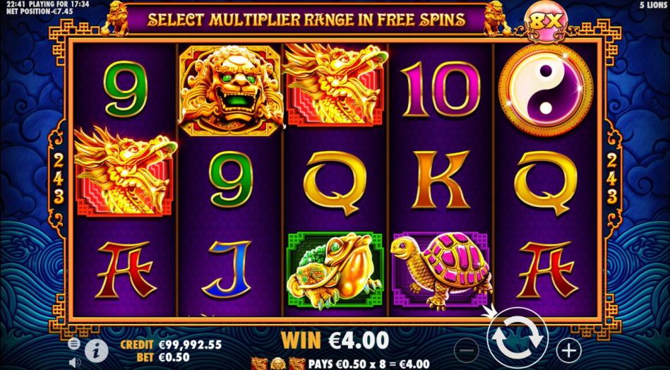 5 Lions adalah slot video dengan 5 gulungan dan 3 baris serta 243 cara untuk menang. Sistem «all ways pay» berarti setiap simbol yang cocok pada gulungan yang berdekatan dari kiri ke kanan akan membentuk kombinasi kemenangan, terlepas dari posisinya pada gulungan. Ini memberikan banyak peluang untuk meraih kemenangan dalam setiap putaran.