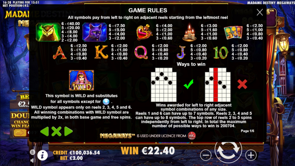 - Wild Multipliers: Simbol Madame Destiny Wild menggantikan simbol lain dan menerapkan pengali 2x pada setiap kemenangan yang melibatkannya.