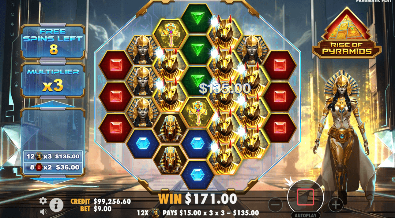 Rise of Pyramids adalah slot dengan tema Mesir dan fiksi ilmiah yang dikembangkan oleh Pragmatic Play. Slot ini menggabungkan dua genre yang berbeda, menampilkan seorang ratu Mesir di dunia futuristik. Visualnya mengesankan dengan desain unik yang menghadirkan elemen futuristik pada tema Mesir klasik.