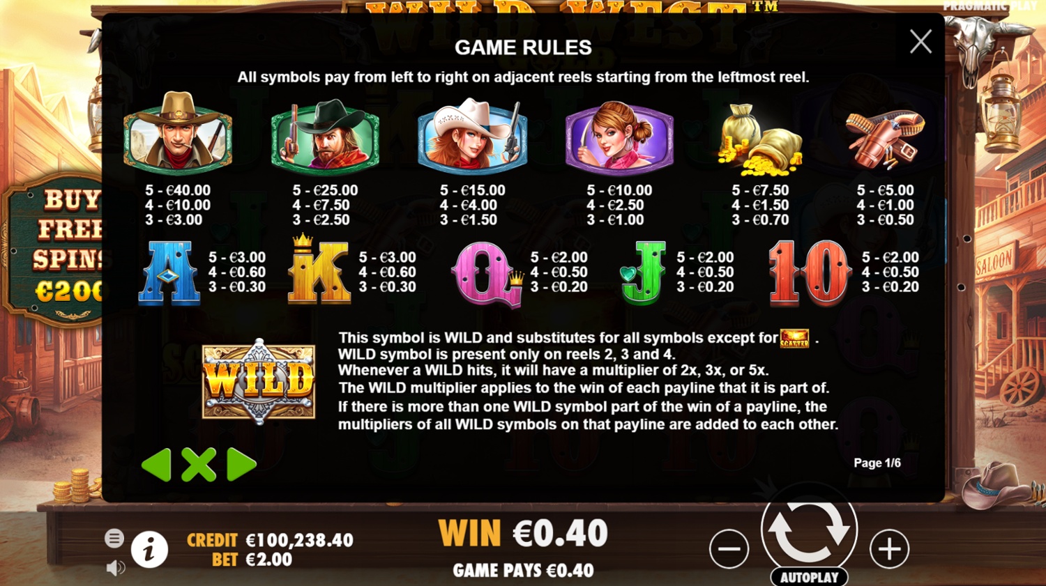 Wild West Gold menggunakan sistem Garis Pembayaran dengan konfigurasi 5 gulungan dan 4 baris, menawarkan total 40 garis pembayaran tetap. Pemain harus mencocokkan simbol pada garis pembayaran untuk meraih kemenangan.